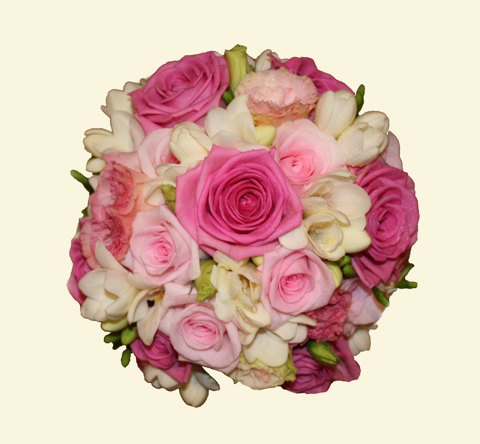 Sarah wanted a bouquet that incorporated roses and freesias and the colours pale pink, mid pink and white. I used Sweet Akito and Aqua roses, Ambassador freesias and Echo Champagne eustoma.